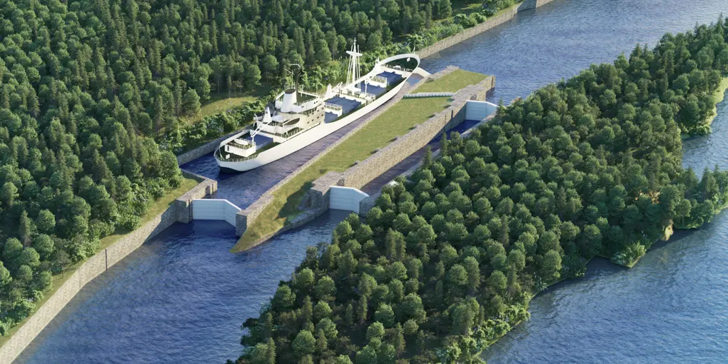 En kanal som går in i en rektangulär sluss enligt en rak linje är en relativt lättbyggd lösning – när det handlar om att bygga både sluss och farled på en helt ny plats. När det redan finns en farled som den nya slussen ska återansluta till blir förutsättningarna annorlunda. Då ger en trekantig sluss fördelar vad gäller både miljö, kostnader och säkerhet.