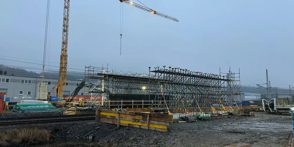 För att säkerställa säkerheten under det kritiska momentet, där stålbalkar ska lyftas på plats som en del av brokonstruktionen kommer spårvägstrafiken att vara avstängd. Här byggs just nu den form som betongen ska gjutas i så småningom när alla grundmoment är klara.