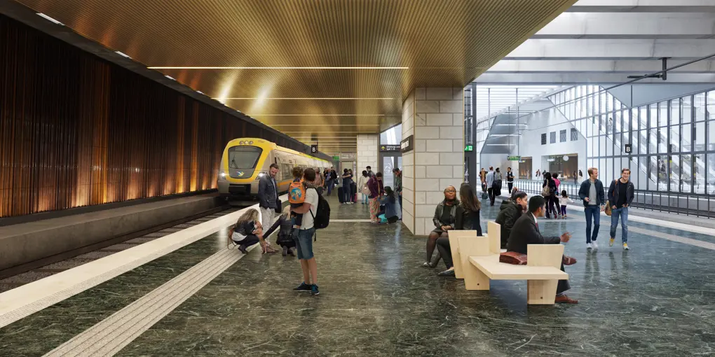 Resenärer som anländer tills stationen möts av ett stationsrum med en central högre del, där ljusgrå skiffer täcker väggar och pelare. I mitten av stationen ökar takhöjden ytterligare. Här löper ljusa betongbalkar i taket. Mellan dessa installeras glasbetong som släpper in ljus och skapar kontakt med det nya stationshuset ovanför.