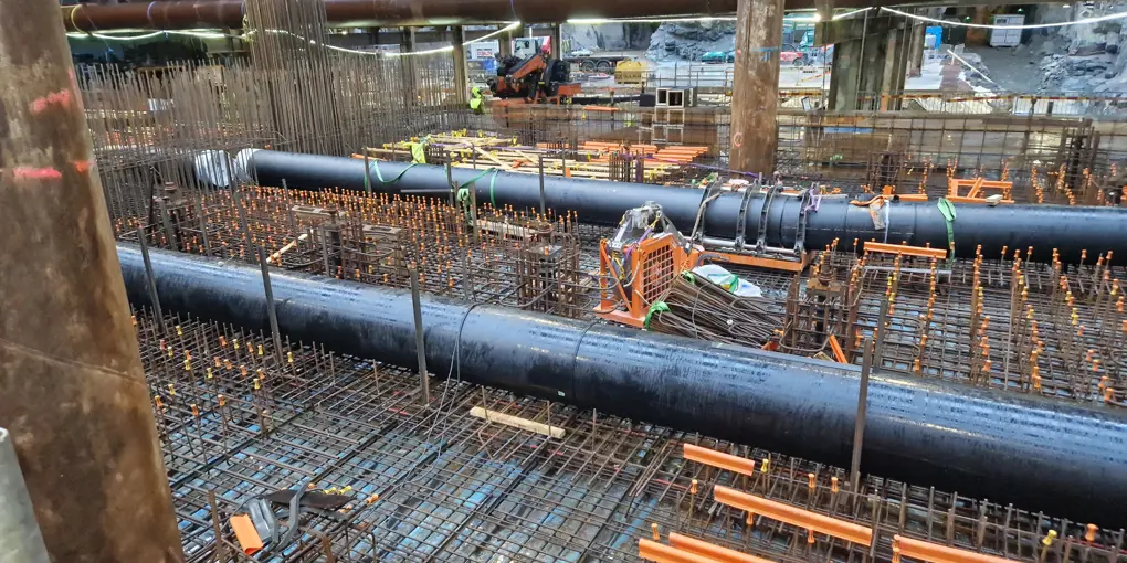 När den nya tågstationen är klar kommer stödkonstruktionen att störa det naturliga flödet av grundvatten. För att återställa detta flöde har det gjutits in sex rör i betongplattan som ger en självreglerande lösning.