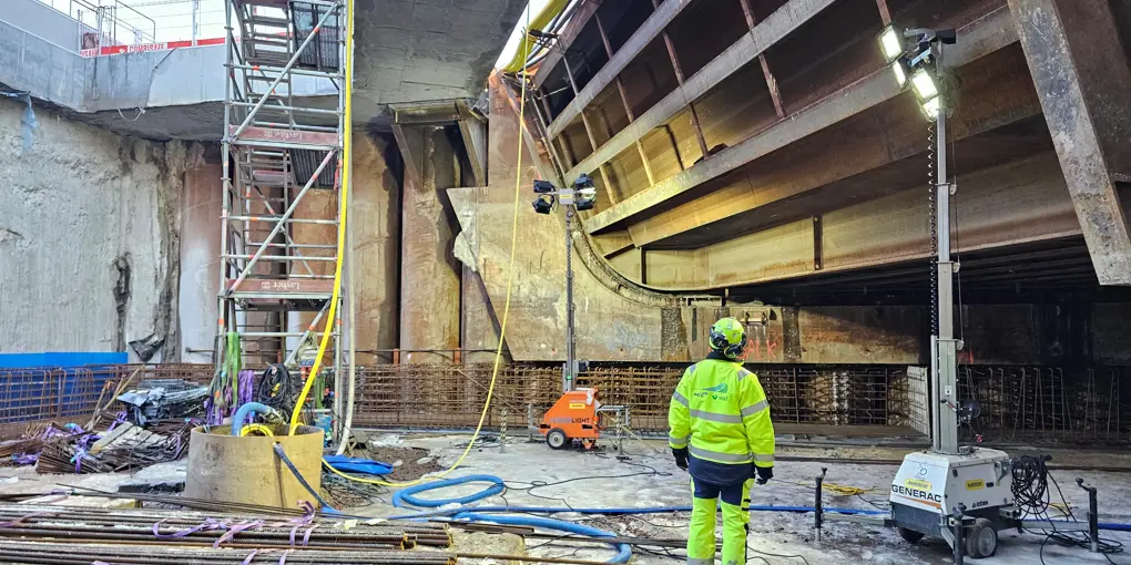 I takt med att vi gräver oss ner sätter vi upp stålrör eller stämp som de kallas för att sidorna inte ska rasa in. Vi kommer att ha tre nivåer av stämp och nedersta nivån utgörs av betongstämp.