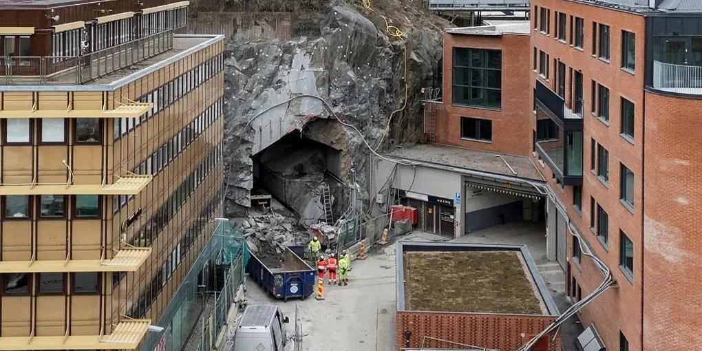 Vid Otterhällans södra servicetunnel som mynnar vid Rosenlundsplatsen, har vi sedan oktober 2024 avlägsnat bergmaterial genom vajersågning och blind cuts, en metod där vi brutit loss berg utan en öppen tunnelände. Nu har vi nått en bit in i berget och ska förstärka berget och täcka mynningen innan vi fortsätter tunneldrivningen med nästa arbetsmetod – sprängning.