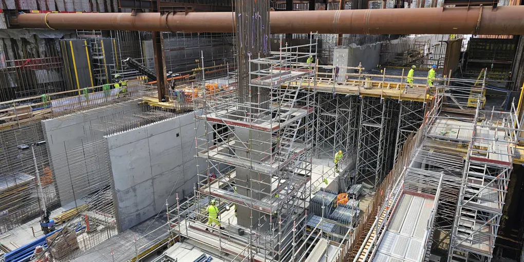 I slutet av 2024 gjöt vi den sista delen av bottenplattan i Korsvägen. När golvet så att säga var klart började vi bygga ytter- och innerväggar liksom pelare på den plattform som kommer vara mitten av stationen.