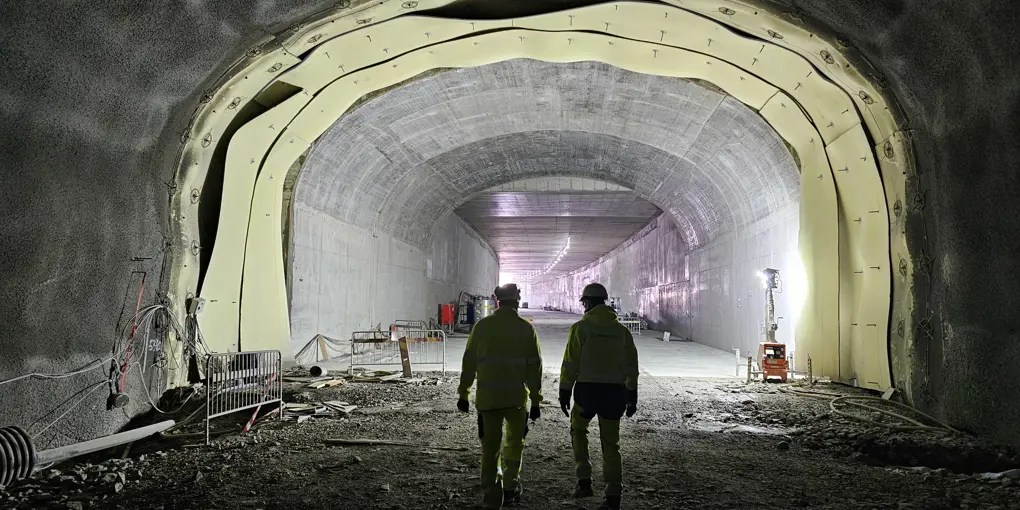 Att sammanföra en betongtunnel som är jämn och fyrkantig med en välvd bergtunnel är mer oslipad är en utmaning. För att få tunnlarnas ytor att matcha varandra gjöt vi ett inslagsvalv inuti berget som gav det en fin och jämn välvd yta att mötas på.