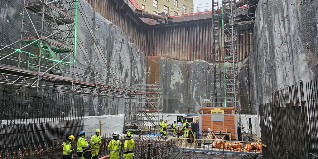 Det är ett trångt och djupt schakt att arbeta i. Själva schaktet är 40 meter långt, ca 20 meter djupt under marknivån och 20 meter brett. Det medför utmaningar med logistiken för att det är ont om plats att lägga material på sidorna och det krävs många flyttar av bygghissar och trapptorn för att säkerställa utrymningsvägar när vi arbetar. Betongarbetena kommer att hålla på året ut. När vi är klara finns det golv, väggar och tak och ett hisschakt. Markytan kommer sedan att återställas uppe på Olof Wijksgatan.