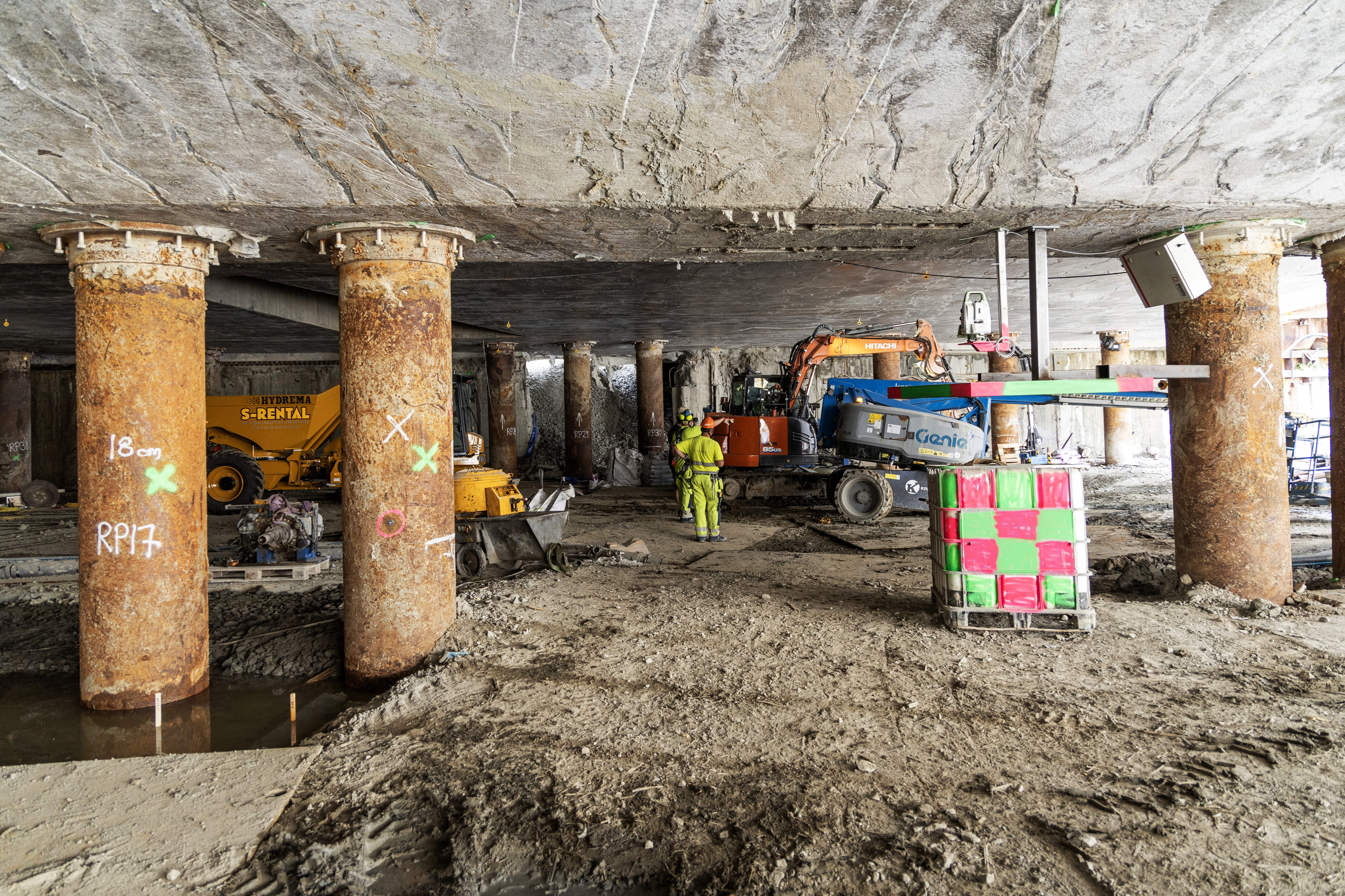 För att bära upp konstruktionen och kunna utföra schakten på ett säkert sätt borrade vi sommaren 2020 30 stålpålar (kingposts) på plats och installerade 30 slitsmurar.