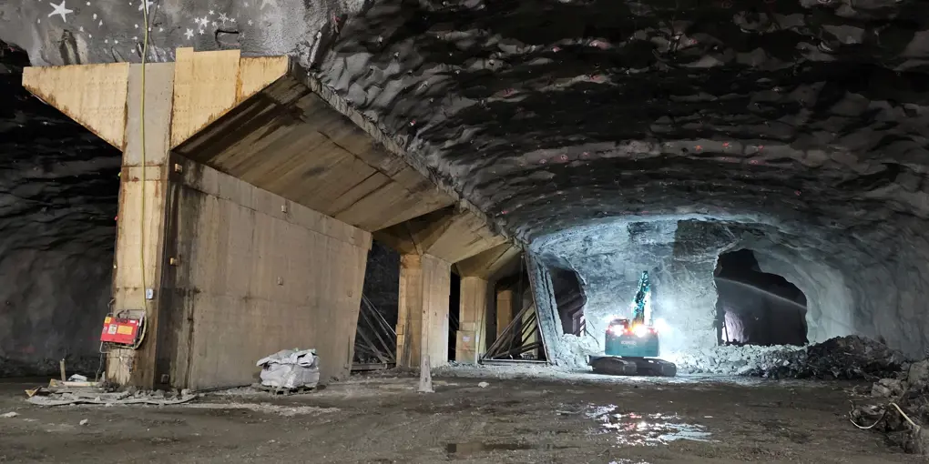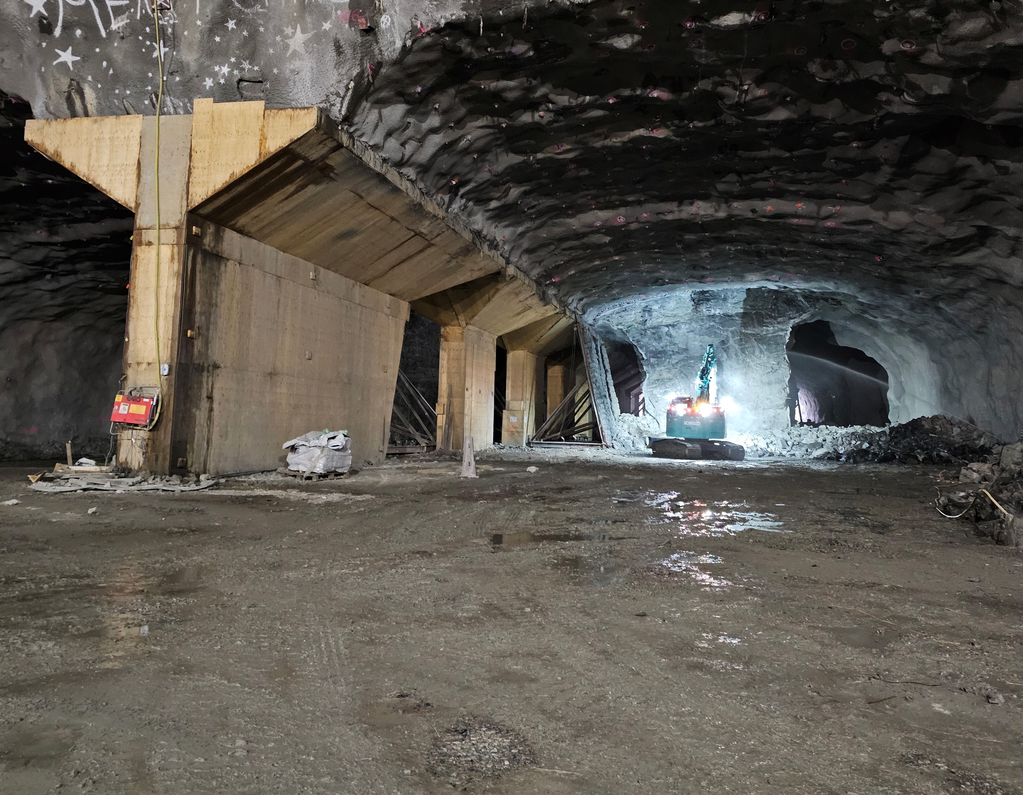 I det öppna schaktet närmast E6 mot Jakobsdal arbetar vi med förstärkning av berget och gräver oss djupare ner i den stödkonstruktion som finns där sedan tidigare.