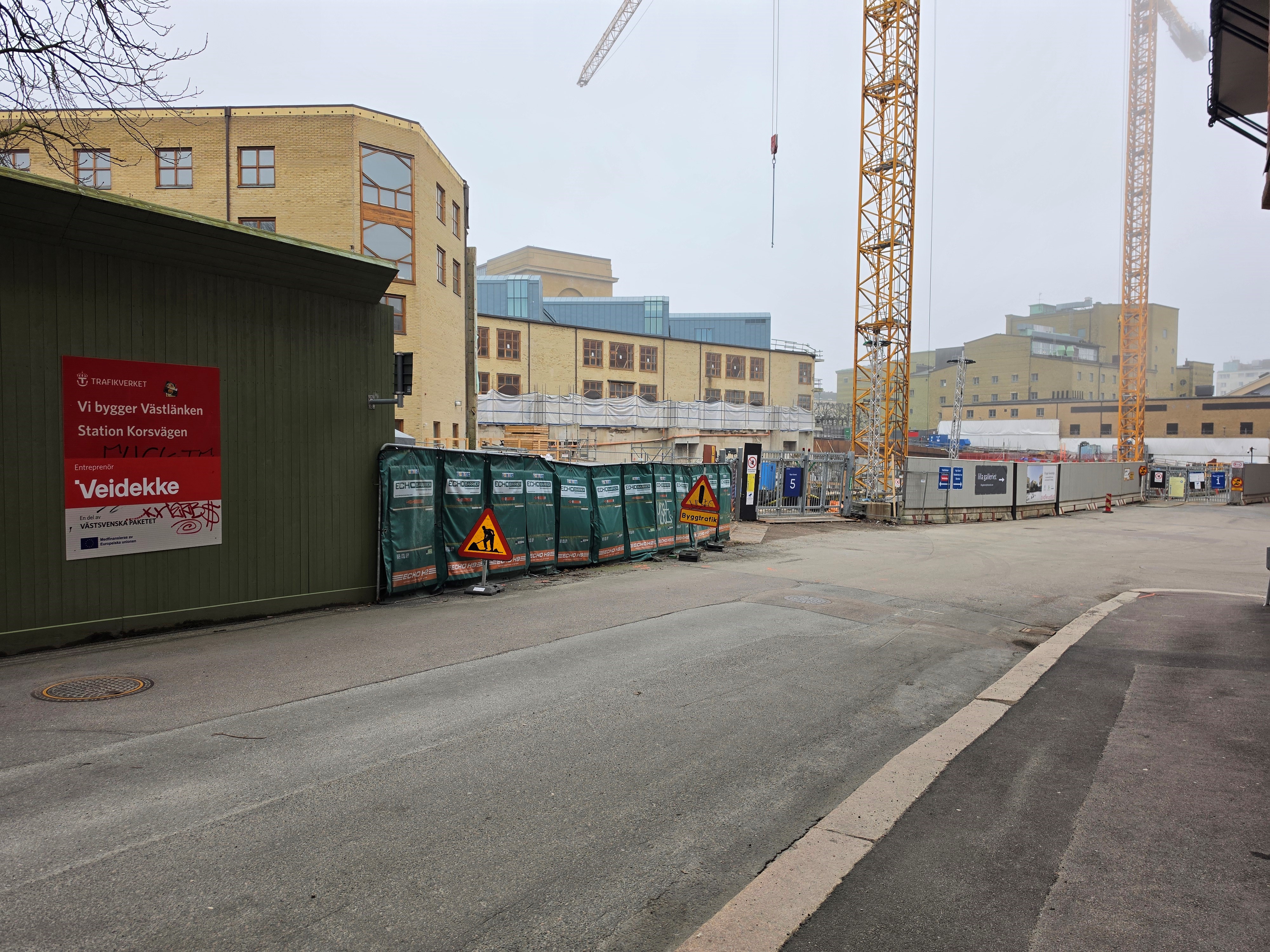 Station Korsvägen kommer att få tre entréer, och just nu fokuserar vi på arbetet på den västra entrén i Johanneberg. Den begränsade ytan vid entrén ställer höga krav på logistiken med många omlokaliseringar av bygghissar och trapptorn för att säkerställa säkra utrymningsvägar.
