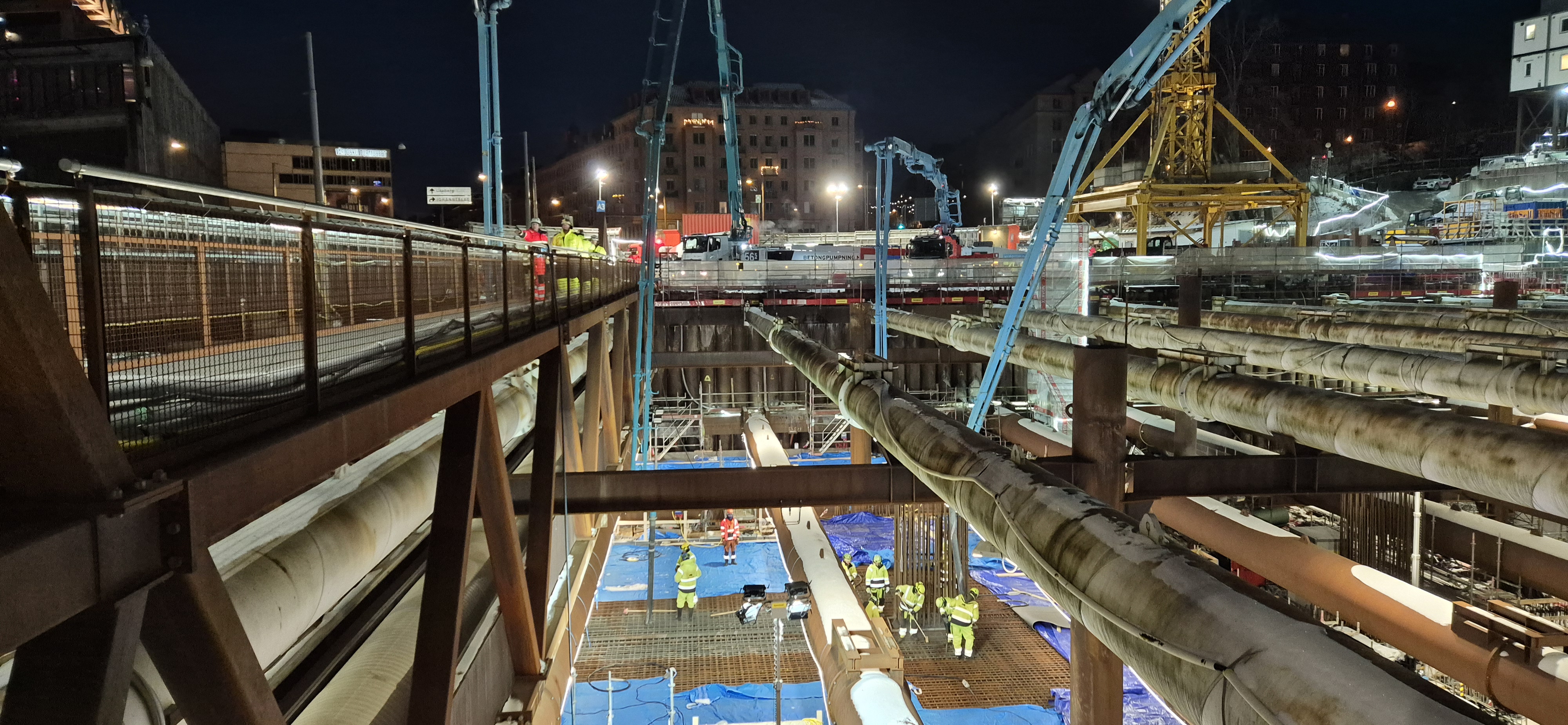 På onsdagen gjöts de första delarna av mellanbjälklaget eller taket/golvet som ska bli en del av mellanplan för station Korsvägen. Trots kylan kunde gjutningen genomföras under de 14 timmar som arbetet tog att genomföra.