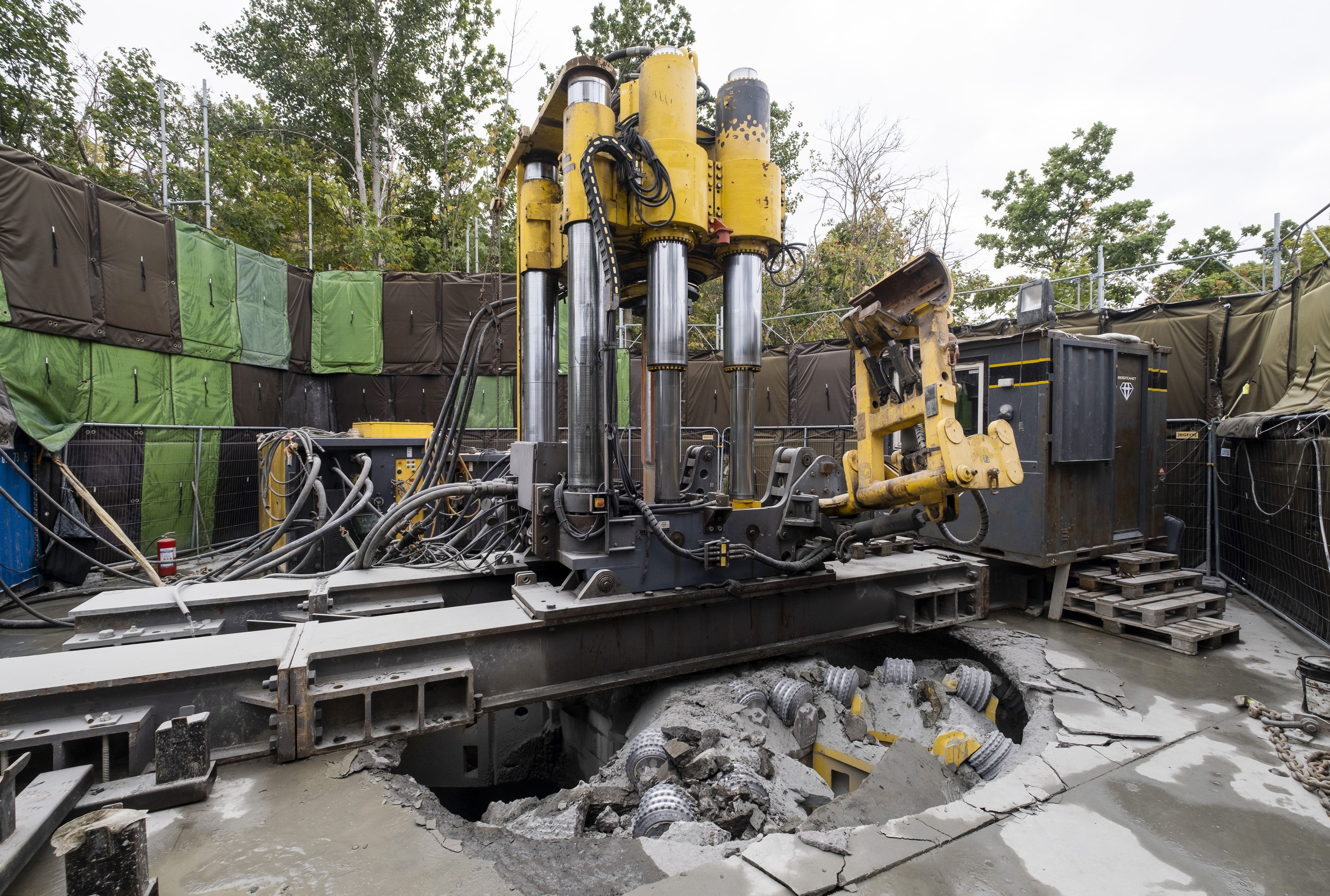 Själva schaktet för anläggningen bygger vi med tekniken raiseborrning. Samma teknik användes för att bygga ventilationsschaktet bakom Föreningsgatan/Södra Viktoriagatan. Raiseborrning är en sprängfri metod som inleds med att vi borrar ett mindre pilothål från marknivå till ett underliggande bergrum.