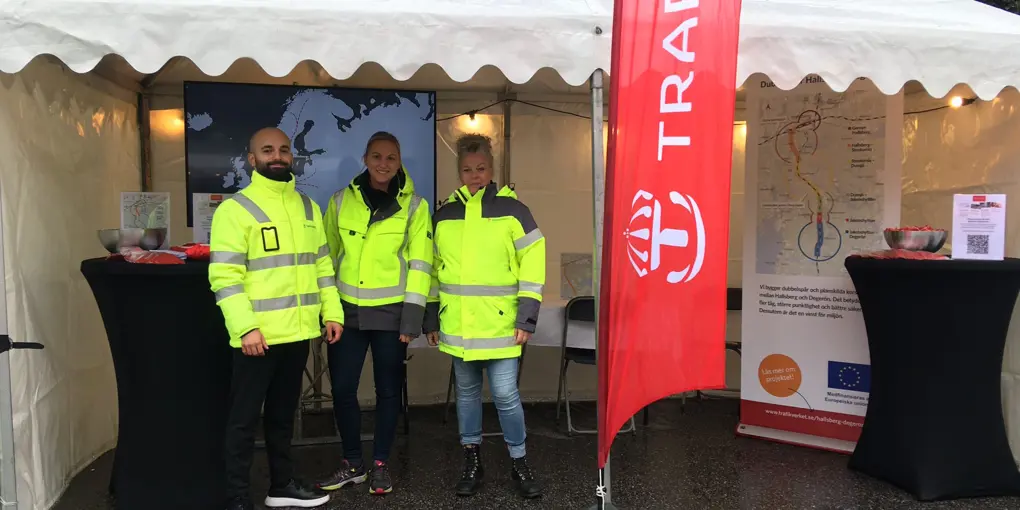 Den 4 oktober kommer vi att stå i ett tält på Hallsbergsmarken. Där kan du ställa frågor till oss och få mer information om den dubbelspåriga järnvägen som vi bygger i ditt närområde.