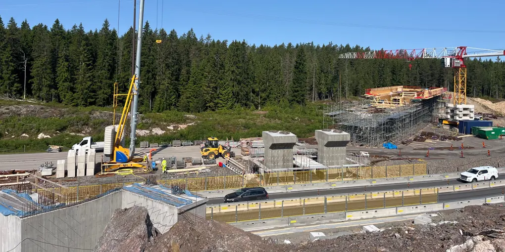 På väg 50 genom arbetsområdet är hastigheten nedsatt till 50 km/h. Vägen är avsmalnad till en fil i vardera riktning. Vi har nu gjutit samtliga brostöd. Ett stöd behövde rivas på grund av att betongens frostbeständighet blev underkänd vid en provtagning, men vi har nu byggt upp det igen. Under sommaren kommer vi att arbeta vidare med ställning, form och armering för broöverbyggnad.