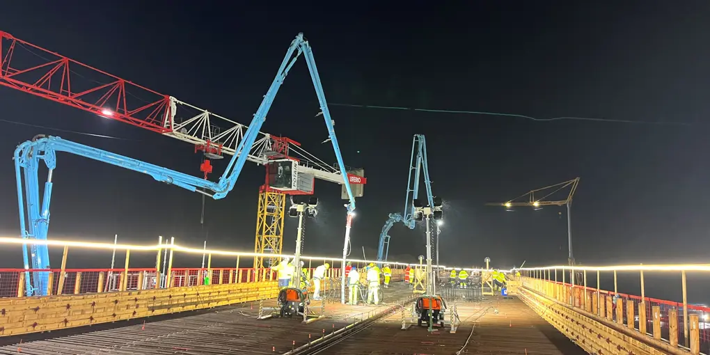 Den 7–8 oktober göt vi broöverbyggnaden vid väg 50, utan störningar och helt enligt tidplan. Cirka 1500 kubik betong levererades under 36 timmar. Nu fortsätter vi med spännarmering i överbyggnaden samt form och armering för landfästen.