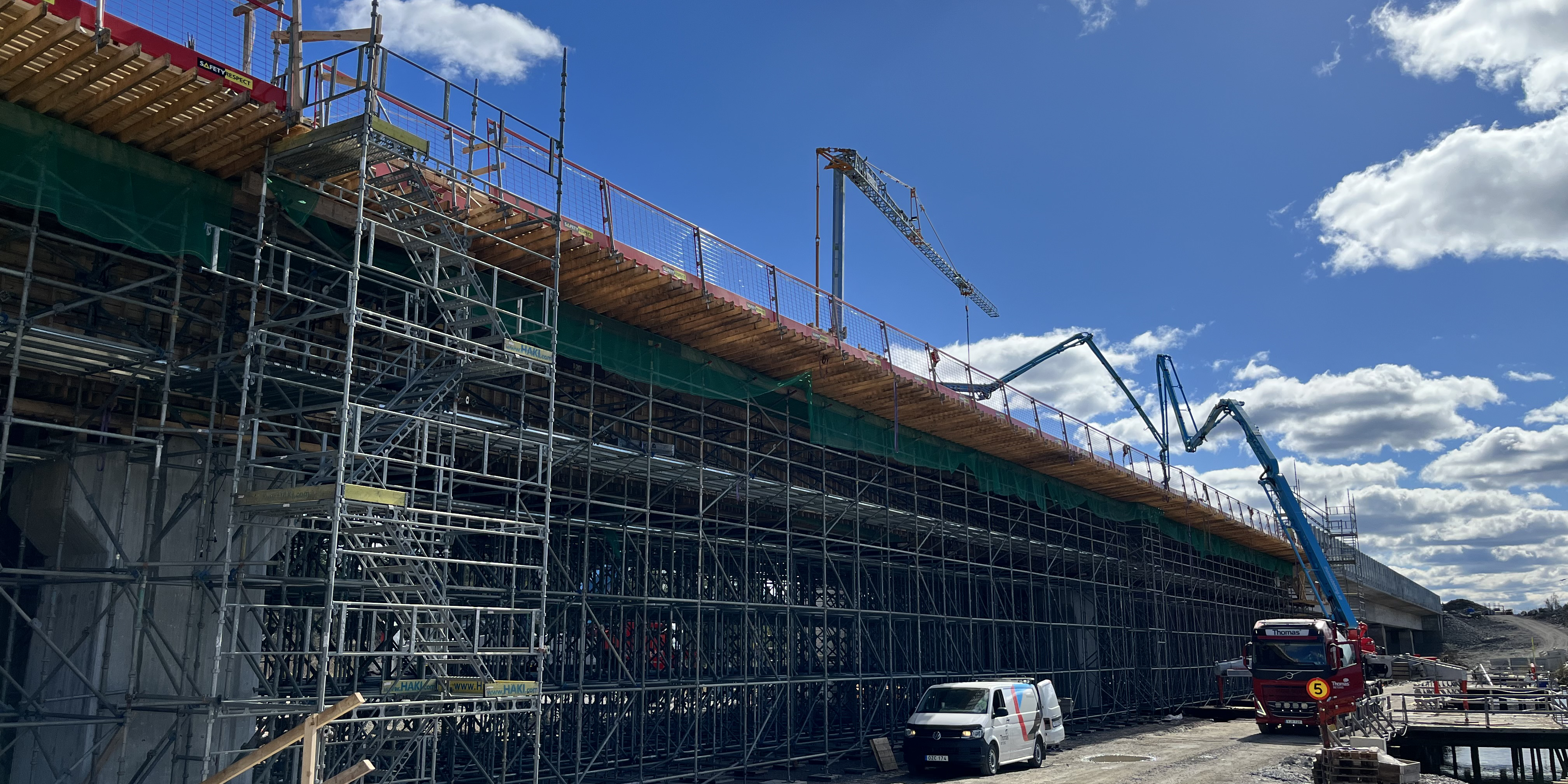Gjutningen av den sista etappen genomfördes med kontinuerliga leveranser av betong till arbetsplatsen. Totalt använde vi cirka 1 300 kubikmeter betong. Precis som vid tidigare gjutetapper har arbetet pågått utan avbrott för att säkerställa kvaliteten i konstruktionen.