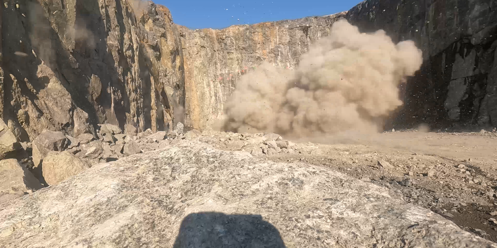 I den här videon kan du se när den första salvan sprängs i Norrbotniabanans tunnel på sträckan Umeå–Dåva.