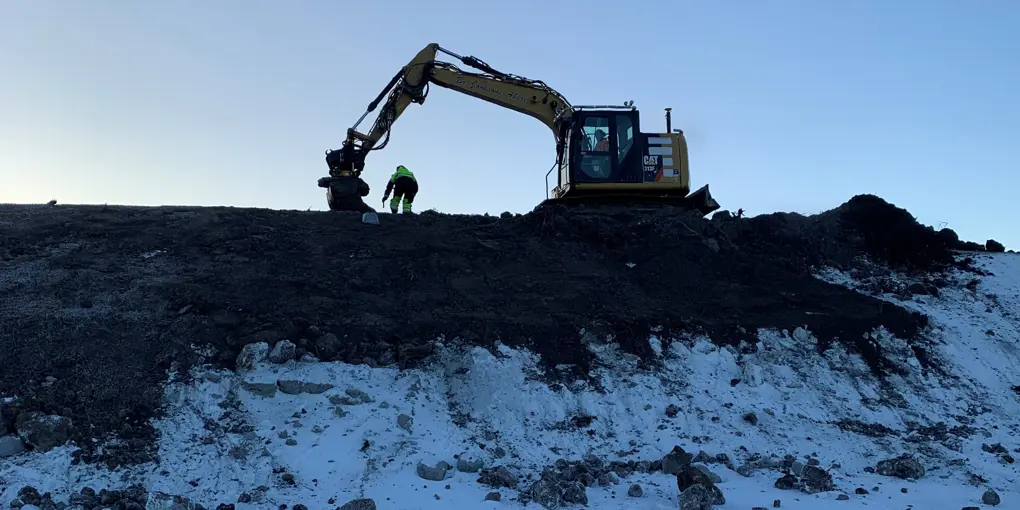 För bullervallen vid Ersforsen jobbar vi också på att färdigställa formen. Här lägger vi på avtäckning för att snygga till bullervallens form.