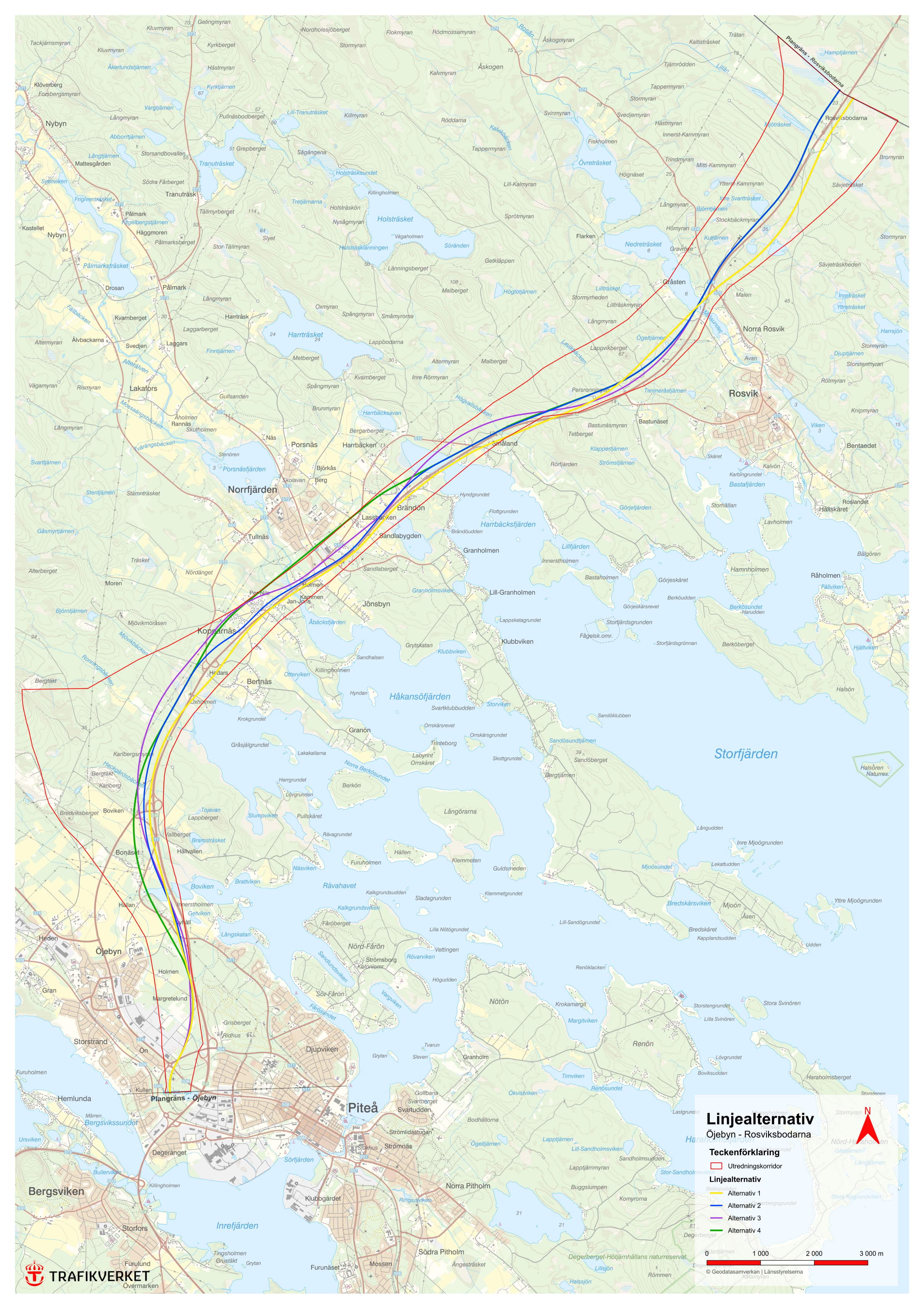 I det kommande arbetet med järnvägsplanen kommer flera linjealternativ att utredas vidare innan ett slutligt alternativ väljs. De alternativ som utreds kan också kombineras, vilket betyder att olika lösningar kan väljas för olika delar av sträckan.
