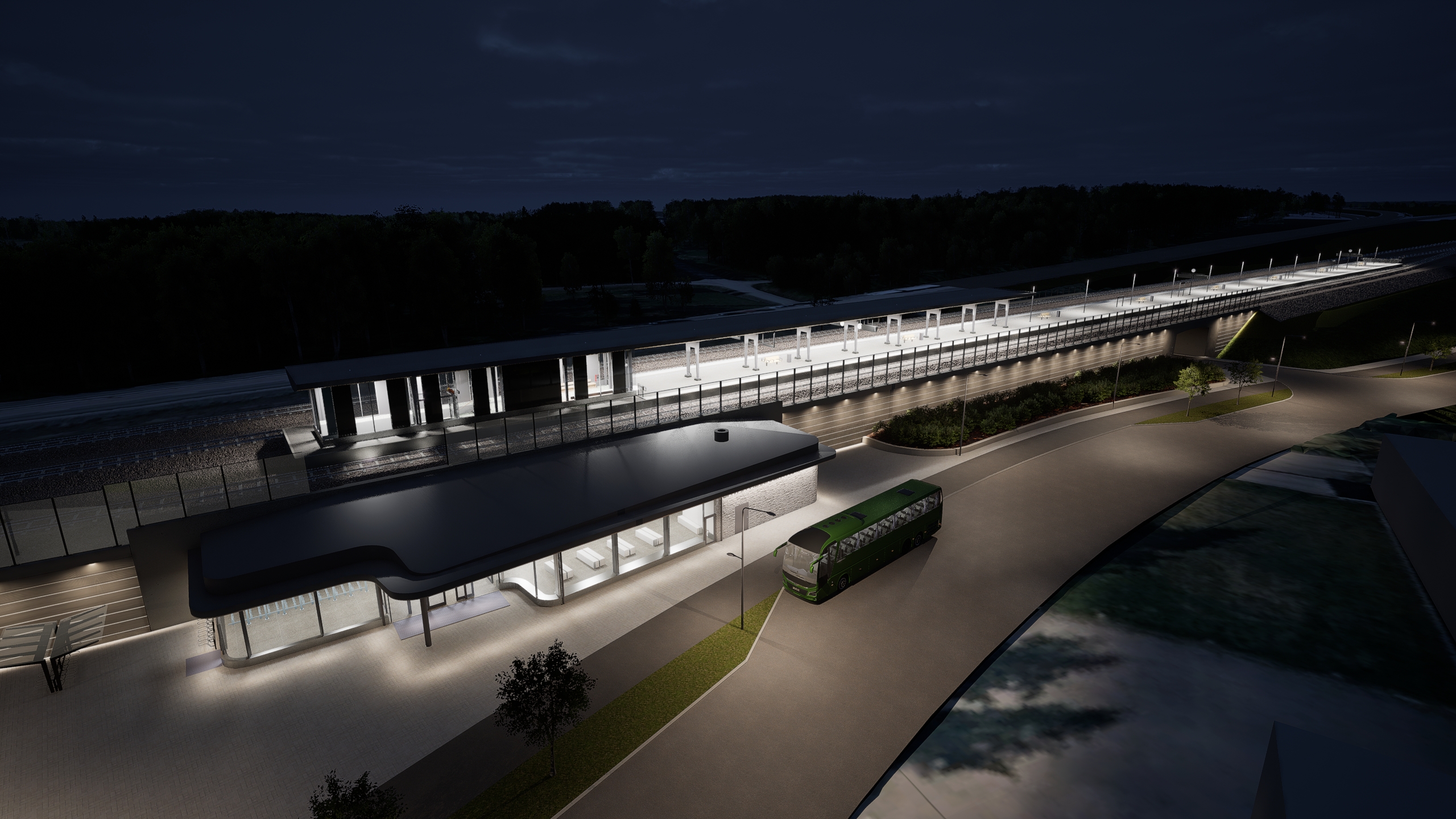 Stationen blir ett nytt inslag i landskapet och väl synlig från många håll. Plattformstaket har därför vinklats uppåt och får belysning som ger anläggningen en tydlig identitet, även på avstånd.