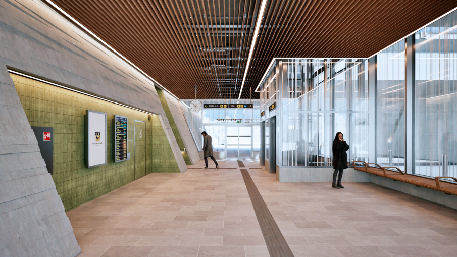 Stationsbyggnaden byggs i två våningar med sittplatser på båda planen. Övre plan ansluter direkt till perrongerna.