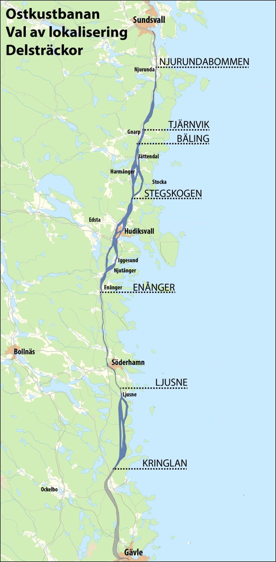 Den cirka 22 mil långa järnvägssträckan mellan Gävle och Sundsvall är enkelspårig och har långa avstånd mellan dagens 25 mötesstationer. Ökad trafik har medfört att restiden mellan Stockholm och Sundsvall förlängts under en period av år, från ca 3 timmar 1996 för snabbaste tåget, till dagens 3 timmar och 35 min.