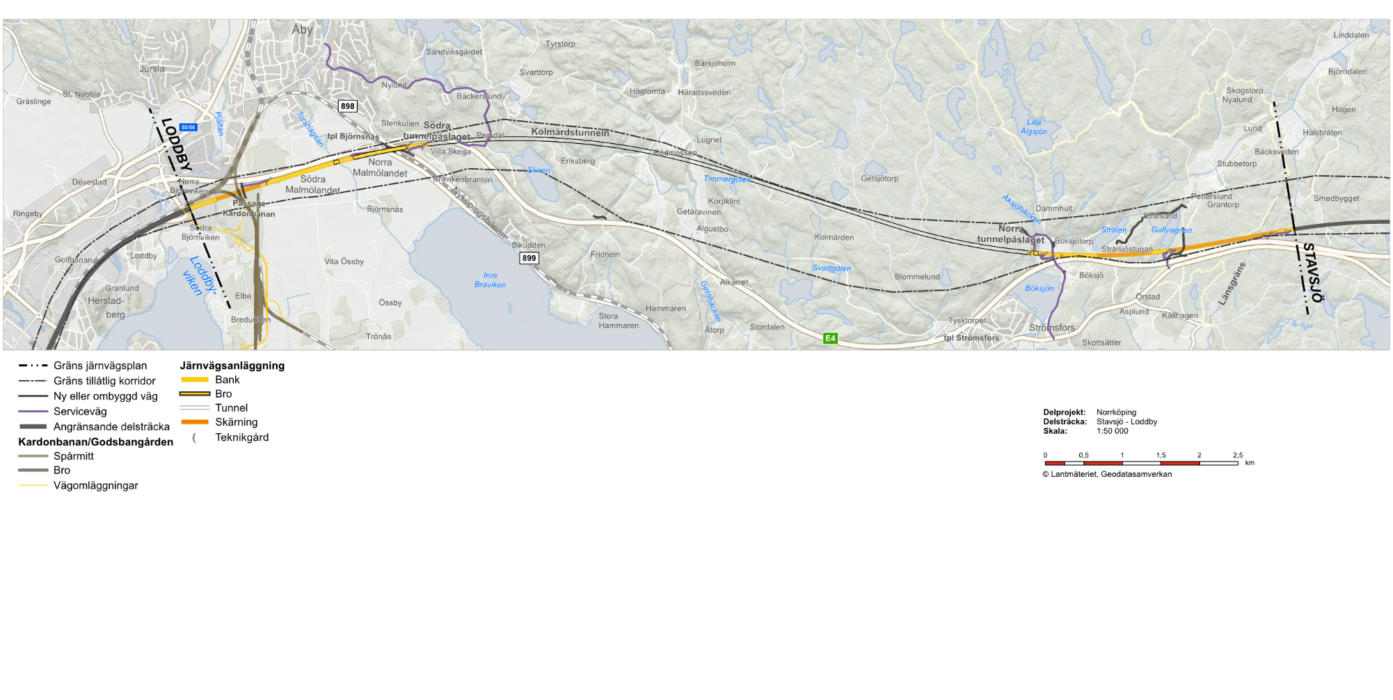 Delsträckan, som tidigare kallades Stavsjö–Loddby, är cirka 15 kilometer lång och går omväxlande på bank, på bro, i skärning och i tunnel. I norr inleds sträckan i höjd med Stavsjö, strax norr om länsgränsen mellan Södermanland och Östergötlands län. Från Stavsjö till norra tunnelpåslaget går järnvägen till stora delar längs med E4. Efter sjön Strålen når järnvägen Böksjötorp och vattendraget Åksjöbäcken som passeras på bro innan järnvägen når det norra tunnelpåslaget vid Böksjö. Den åtta kilometer långa tunneln genom Kolmården består av, förutom ett tunnelrör för dubbelspår, en servicetunnel som anläggs parallellt med spårtunneln samt flera tvärtunnlar och tillfartstunnlar.