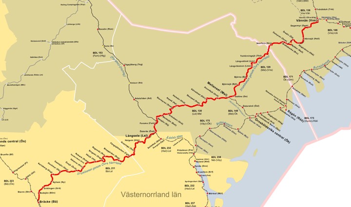 Den totala sträckan mellan Bräcke–Bispgården samt Långsele-Formo är 125 km.
